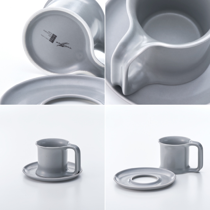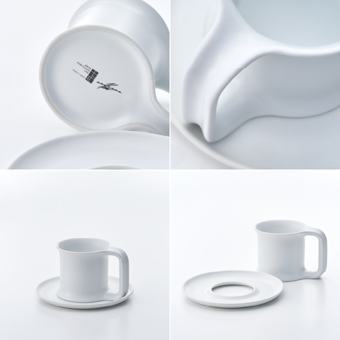 上下対照にデザインされた、"ARITA PORCELAIN LAB" 製作のマグカップと、遊び心のあるドーナツ型のソーサーセット。カップは取手と本体が一体化した流れるようなラインが美しく、ミルク色のマットカラーは温かみのある風合いを湛えます。