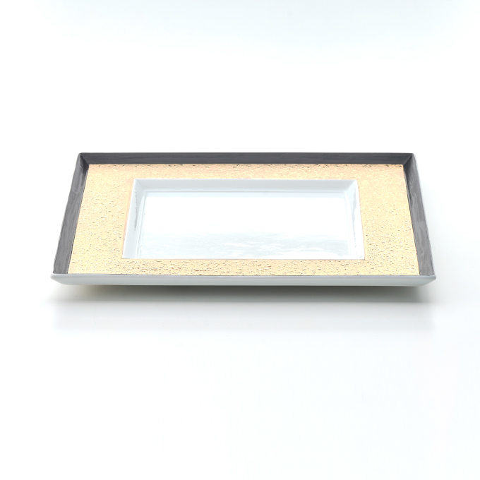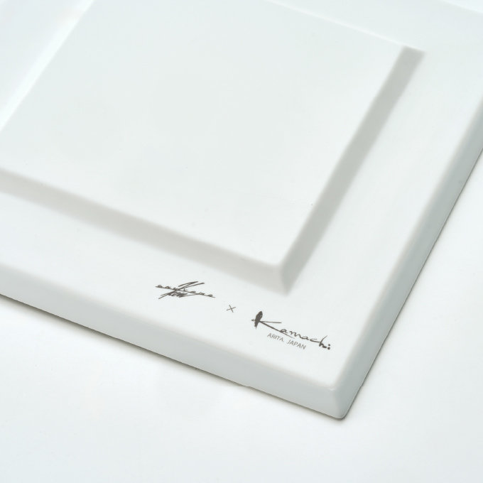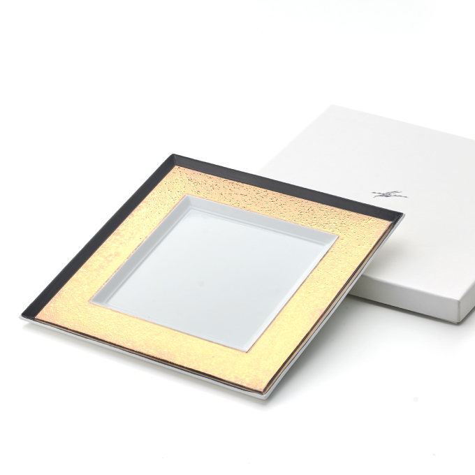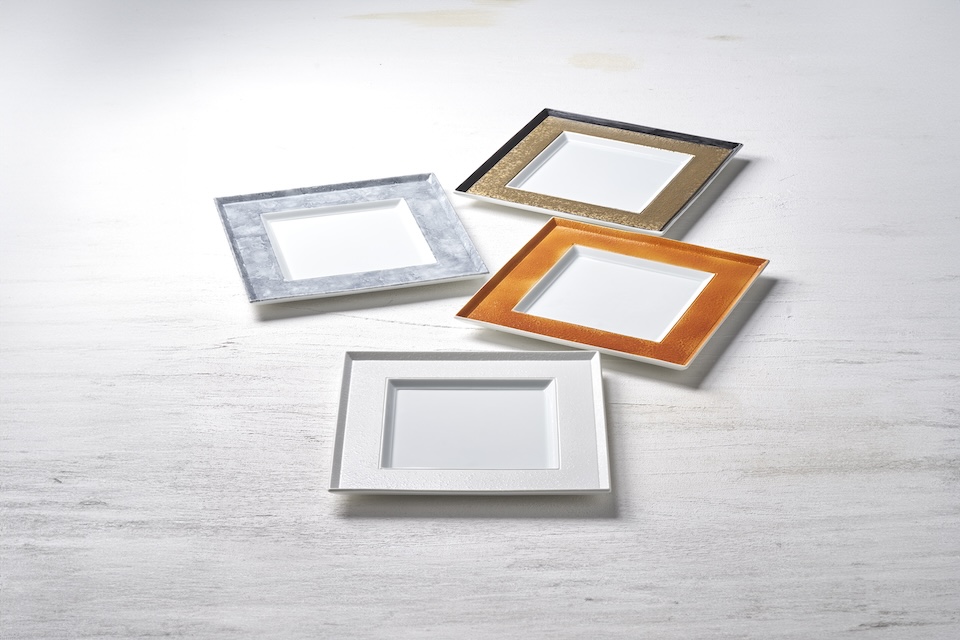 料理を乗せて初めて1枚の絵が完成するイメージでデザインされたお皿です。中でもゴールドは縁にブラックを効かせ、より直線的でシャープなラインにこだわった逸品。製作するのは、有田焼の伝統技法を用いてコンテンポラリーな質感を表現することが得意な “カマチ陶舗”。ミシュランの星を獲得した世界の多くの有名レストランが食器を特注する、名門中の名門です。ゴージャスなゴールドは、フレンチと抜群の相性を発揮します。